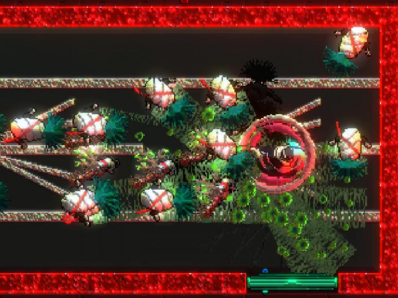 Le jeu adopte une perspective descendante, passant à un style 2D dans les moments narratifs et dans les interactions avec les PNJ. Pendant le combat, les joueurs peuvent courir, attaquer avec leur épée, créer un bouclier qui dévie les projectiles et même effectuer des contre-attaques contre les attaques ennemies. De plus, il existe la possibilité de ralentir le temps, bien que pour une durée limitée, ce qui encourage l'utilisation stratégique de cette fonctionnalité pour maximiser son efficacité. La boucle de jeu suit une structure bien définie : en entrant dans un scénario, les joueurs explorent plusieurs salles remplies d'ennemis, devant déterminer la meilleure approche pour les éliminer. Un détail crucial est que tout coup reçu est fatal, obligeant le protagoniste à repartir de la porte de cette pièce. Ce système diffère de Hotline Miami , où la mort provoque le redémarrage de tout le niveau. Ce qui impressionne vraiment dans Sonokuni , c'est la variété des ennemis. Chaque étape introduit de nouveaux adversaires et de nouvelles combinaisons, nécessitant une adaptation constante de la part du joueur. Par exemple, dans une certaine salle, nous pouvons affronter des archers qui tirent des flèches après un court temps de préparation, des guerriers avec des épées qui lancent des explosions rouges et des ennemis qui courent vers le protagoniste avec des attaques acides. Chacun exige une stratégie différente : l'archer force le protagoniste à attaquer à un moment précis avant de tirer, l'ennemi acide nécessite une esquive immédiate et l'épéiste peut être vaincu en contrant sa propre attaque par une contre-attaque. Cette dynamique renforce le caractère tactique du jeu, obligeant le joueur à définir le meilleur ordre pour faire face à chaque menace.